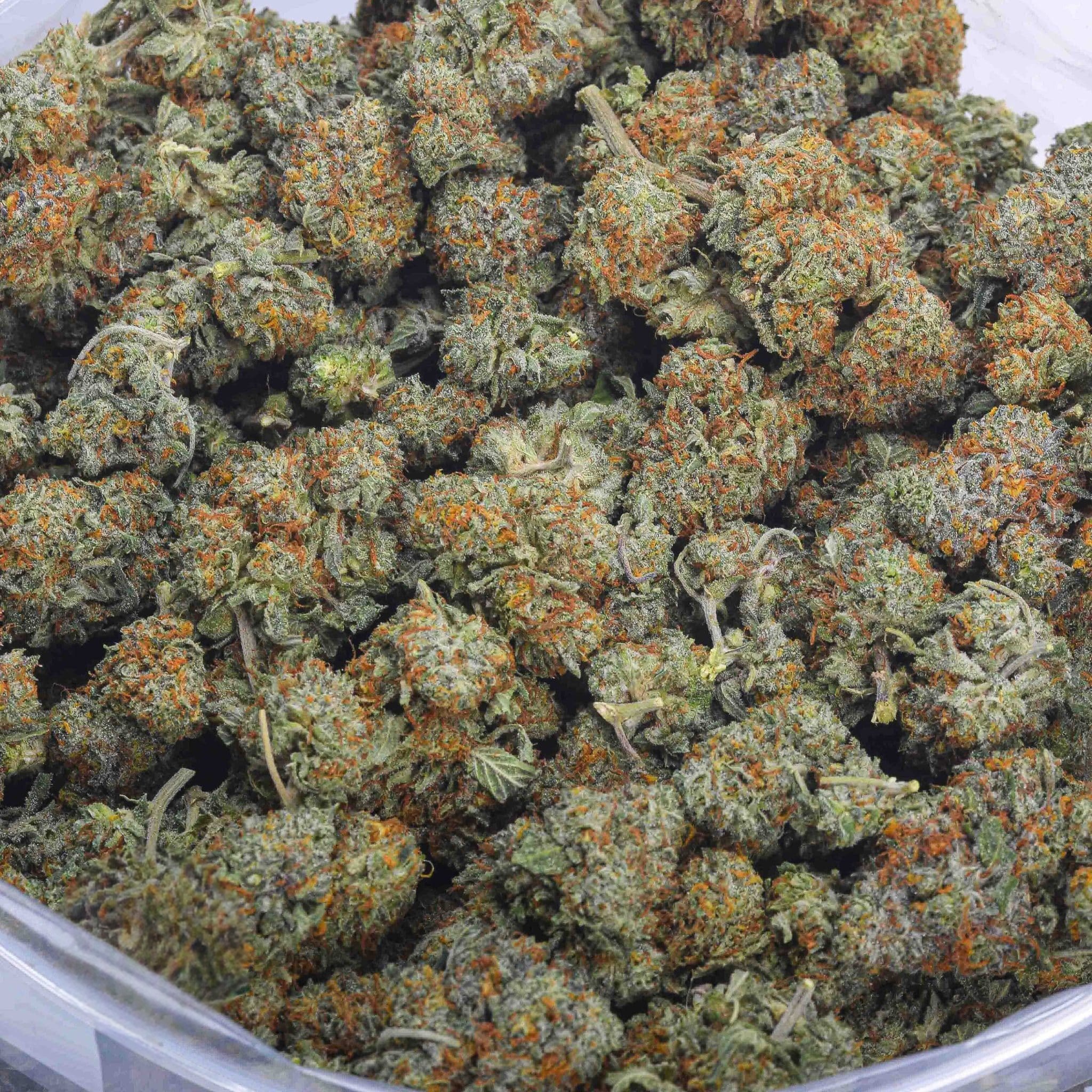 🌿 Appearance – Dense Frosty Buds with Bright Orange Hairs